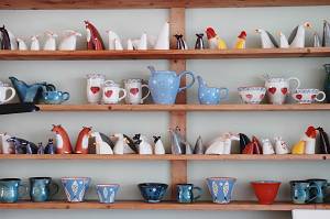 She also makes a range of smaller mugs, cups and bowls with clear, bright underglaze decorations.